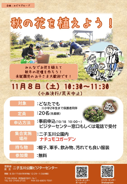 秋になり、二子玉川公園では花の植え替えの季節がやってきました。毎年恒例のイベント「秋冬の花を植えよう!」を、今年もみどりグループ(公園のみどりを育てるボランティアグループ)企画で実施します。