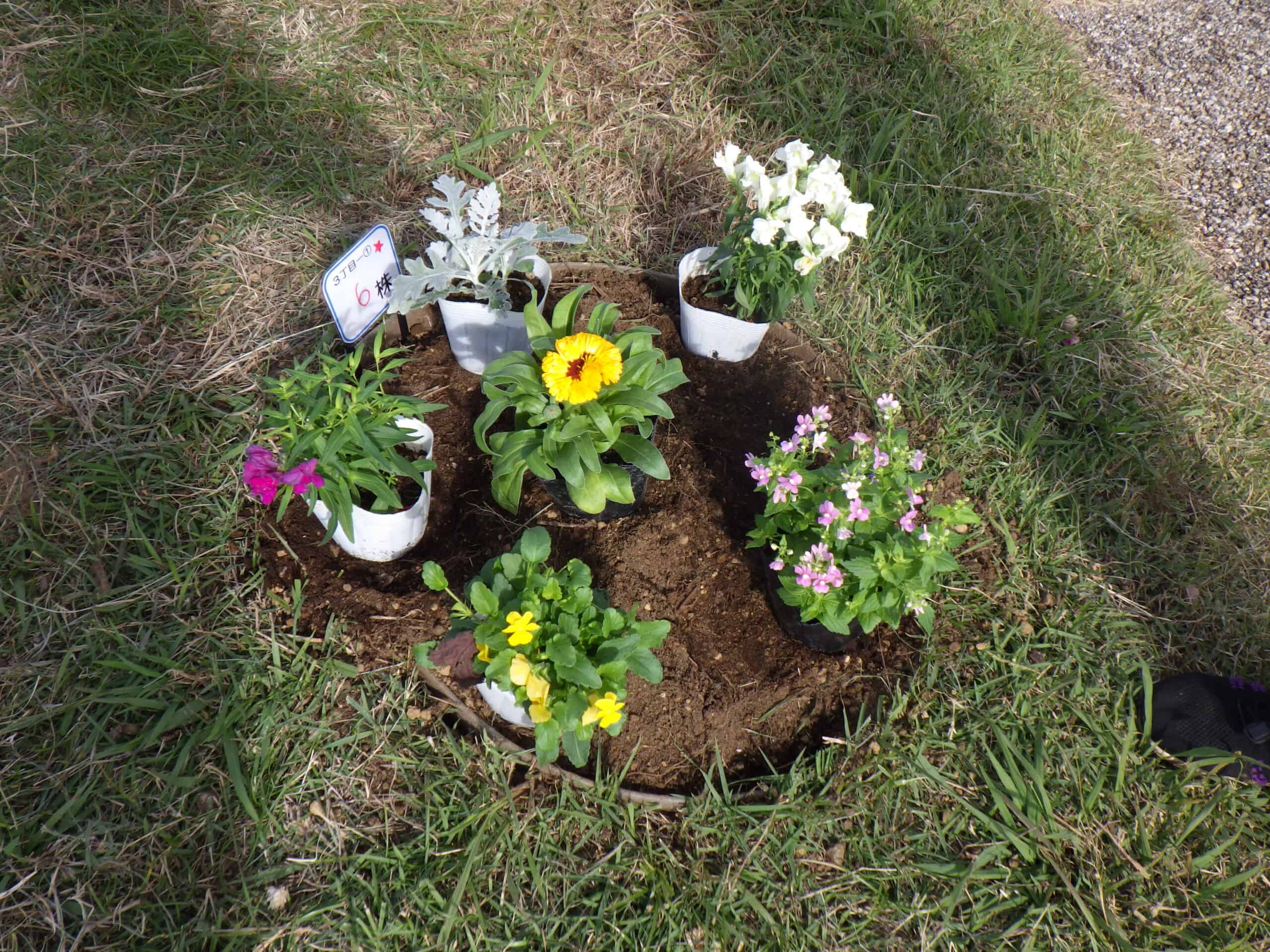 ナチュモコガーデンには芝生の中にいくつかの丸い花壇があります。ご参加の方にはその丸い花壇を1つ程度担当してもらい、好きな花や色を自由に組み合わせて植えることができます。