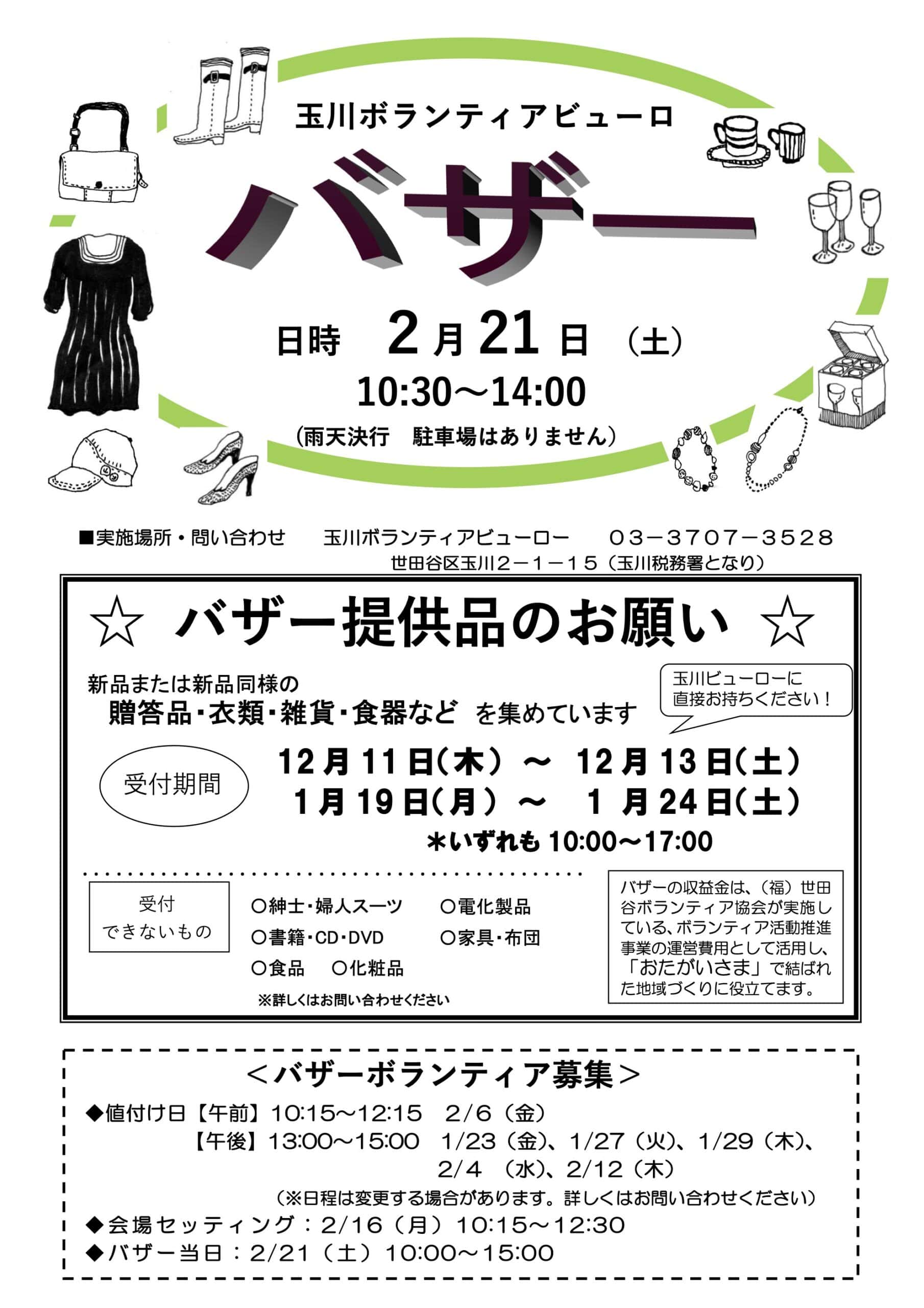 社会福祉法人世田谷ボランティア協会の玉川地域の窓口「玉川ボランティアビューロー」で、2026年2月21日(土)に恒例のバザーが開催されます。