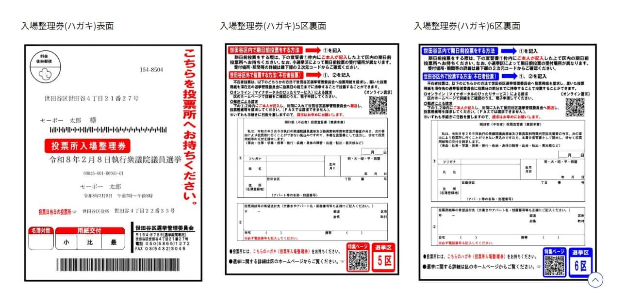 急な選挙日程のため発送作業に時間を要していましたが、入場整理券の配達は当初の予定より早まり、2月2日(月曜日)から2月5日(木曜日)のお届けとなる見込みとのことです。 ※2月4日(水)現在世田谷区公式サイトより