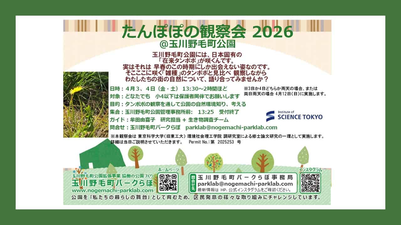 4/3(金)4(土) 玉川野毛町公園で「タンポポ観察会」日本固有カントウタンポポを観察しよう!